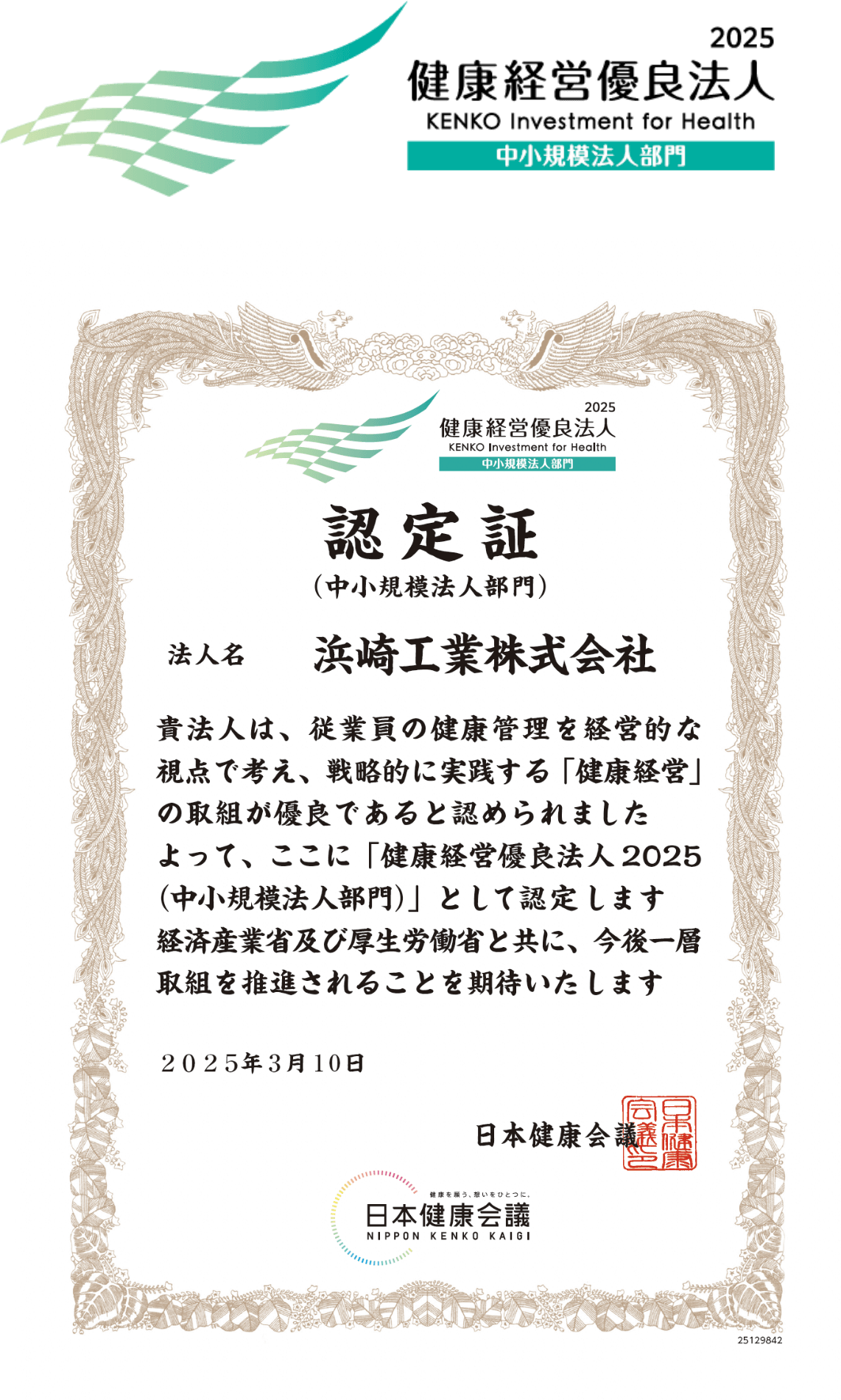 浜崎工業株式会社は、2024年3月11日(月)、経済産業省と日本健康会議が共同で選定する「健康経営優良法人2024(中小規模法人部門)」に初めて認定されました。