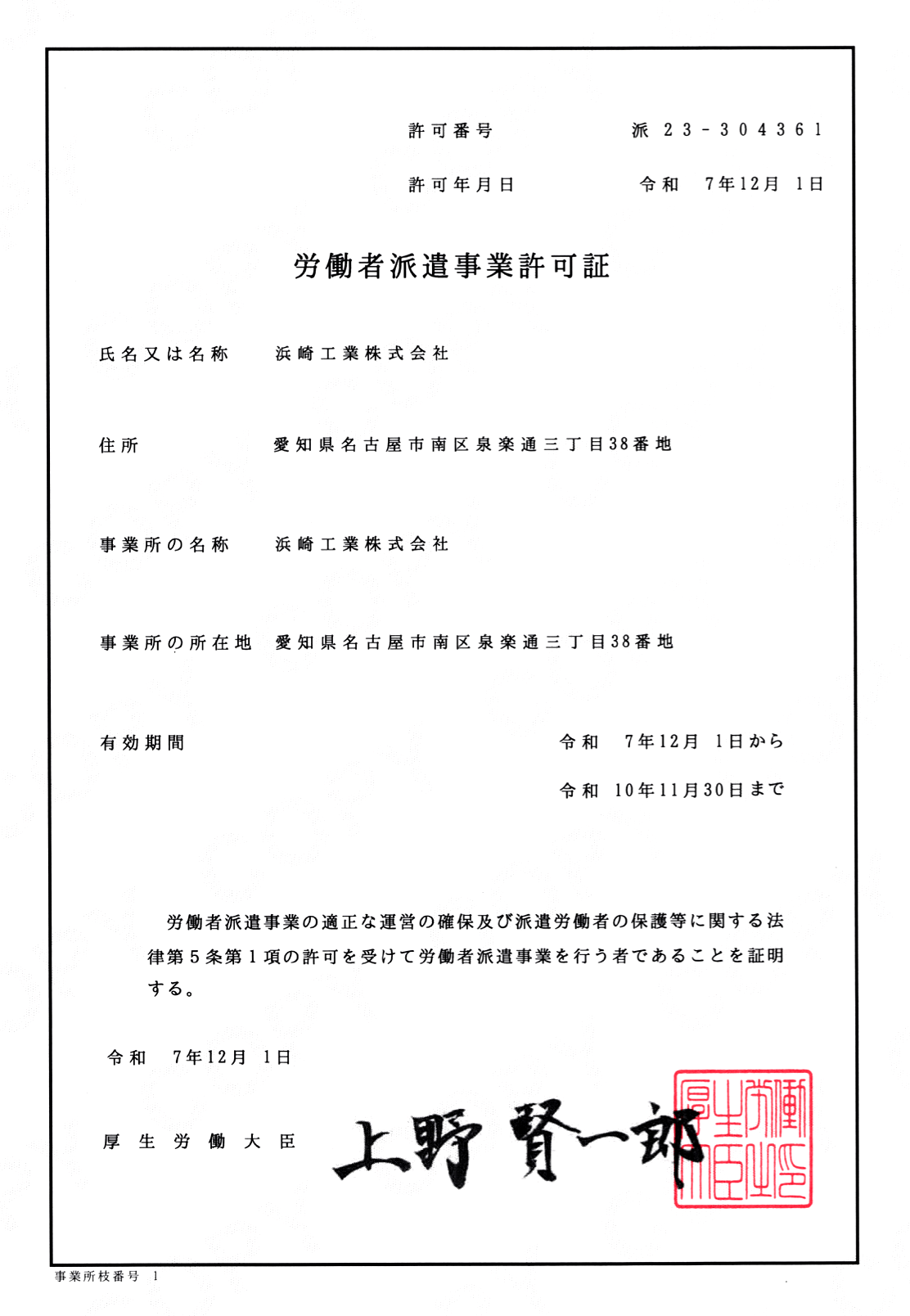 弊社は、労働者派遣事業の許可(許可番号:派23-304361)を令和7年12月1日付で取得いたしましたことをお知らせします。